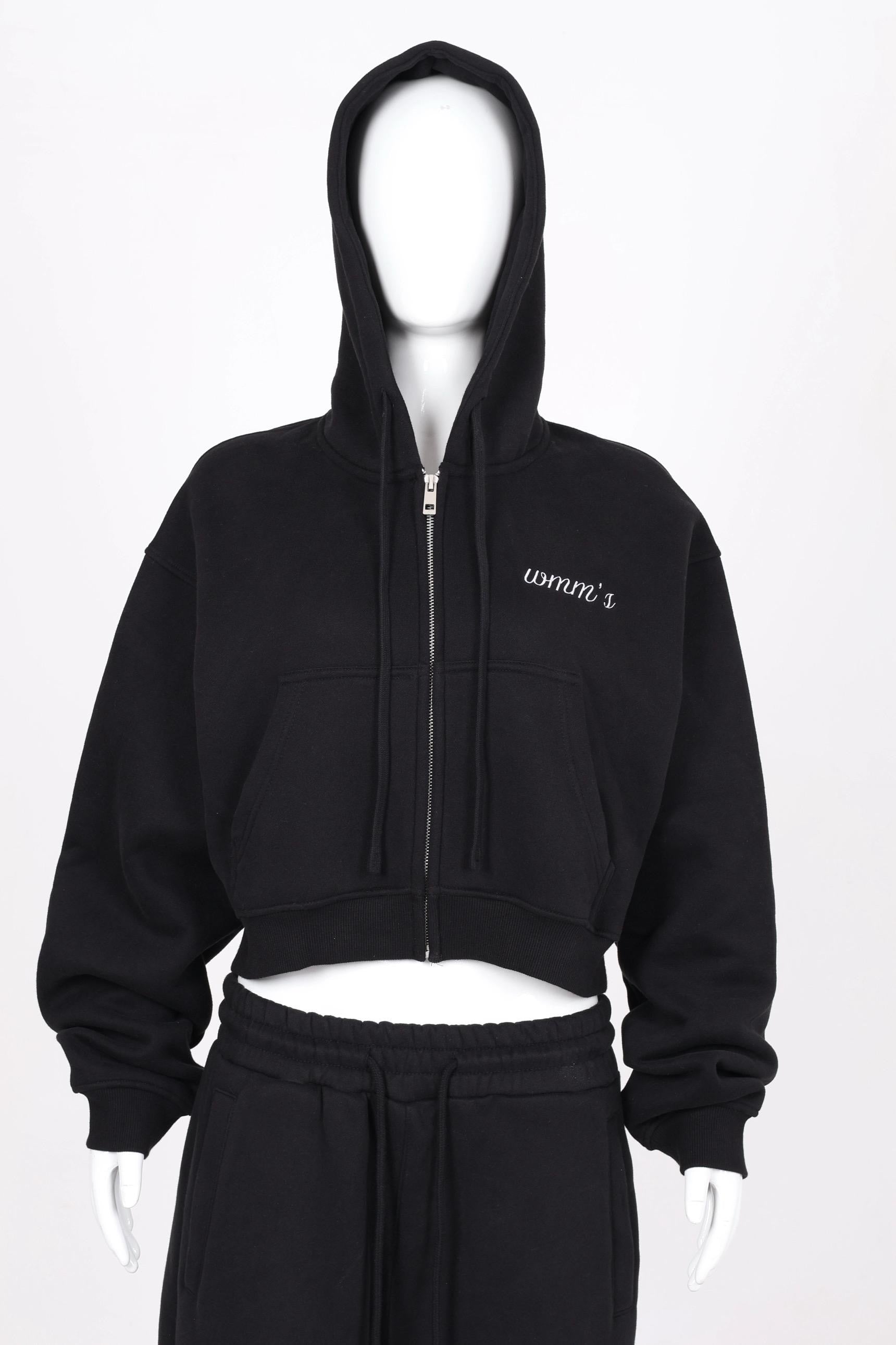 A short black zip-up hoodie for women. It has a cropped fit that sits perfectly on the waist and fits true to size. Soft, stylish, and easy to pair with the sweatpants